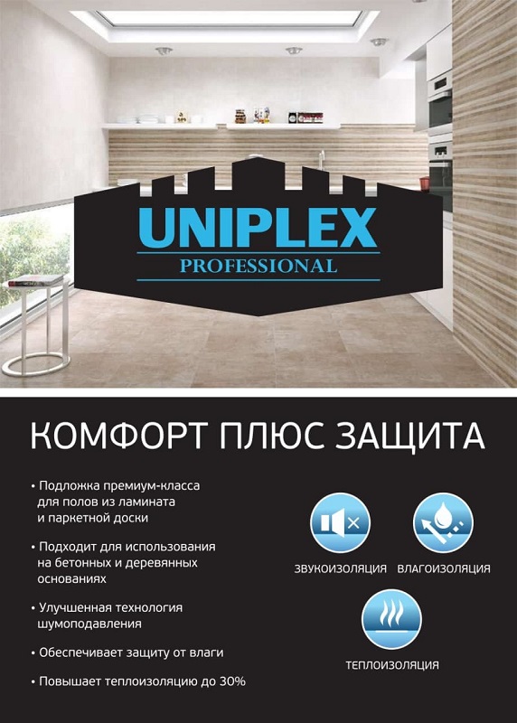 В чём уникальность композитной подложки? Полимерная подложка с гидроизоляцией 3 мм Uniplex Professional обладает технологией «AIR PUMP». Многослойный подкладочный материал, как всё гениальное прост. Конструкция представляет собой пару композитных плёнок с прослойкой из высокой плотности гранул пенополистирола.