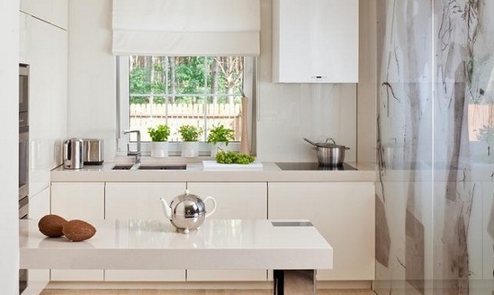 Особое значение в маленькой кухне играет ее цветовое оформление. Безусловно, лучшим решением станет светлая мебель, которая визуально будет расширять комнату. Со светлой мебелью можно создать множество интересных дизайнов. К тому же, белая мебель всегда актуальна и красиво смотрится в любых исполнениях, будь-то классические кухни или же ультрасовременные гарнитуры. На белом фоне красиво смотрятся яркие аксессуары, посуда и декоративные элементы.