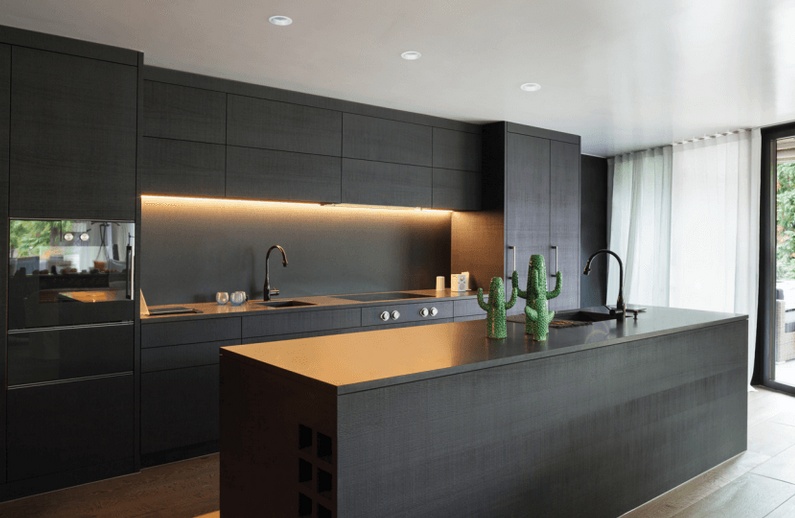 Если дизайн вашей кухни задуман с нарочитой лаконичностью, идеальными для вас будут несколько дизайнерских светильников интересных форм, встроенных в почти бесцветный фронт.