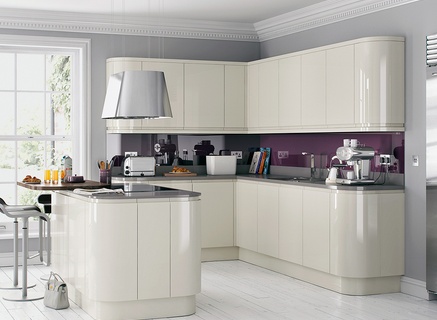 - Минимализм отличается лаконичностью, простотой форм и цветовых решений, использованием ненатурального сырья. Силуэт гарнитура бывает прямого силуэта, допустимы плавные, обтекаемые формы. Фасады могут иметь отражающую или матовую поверхность. Например, глянцевый, а также сатиновый акрил или использование эмали. Для столешницы используется искусственный камень. Ручки на дверцах чаще отсутствуют.