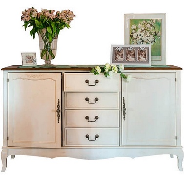Актуальна для прованского стиля мебель из древесины. Обычно используют орех, дуб или каштан. Изделия из этих пород окрашивают, чаще всего, в белый цвет. Но также можно использовать синие или голубые тона. Главное, чтобы предметы интерьера выглядели так, будто выгорели на солнце за долгие годы службы.